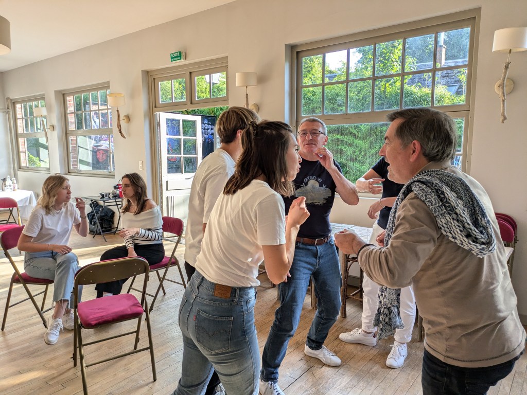 - Jeux et exercices d’improvisation : Exercices intéractifs développant l’écoute, la connexion à soi et aux autres et la réactivité.
